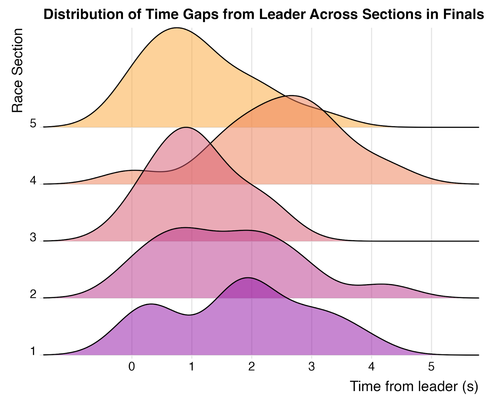 In this instance, thereâs no mystery: the race was decided in section four. The long left tail on the distribution of section four in the above plot is caused by Gracey Hemstreet, where she bettered the next best competitor, Anna Newkirk, by a staggering 1.41 seconds by absolutely dominating the woods. Even in the simulated world, this 1.41 second gap between Gracey and Anna holds true, proving it wasn't just a Finals fluke. If youâre a competitor of Gracey's, you should be studying exactly what on earth she did in that section.