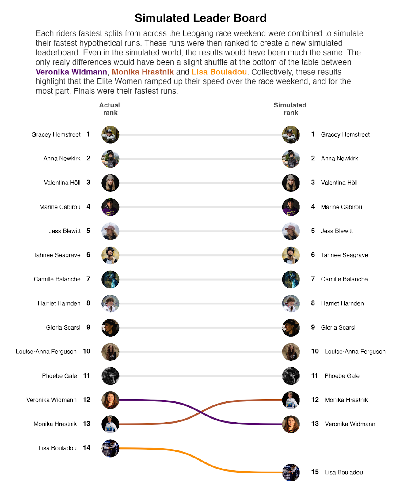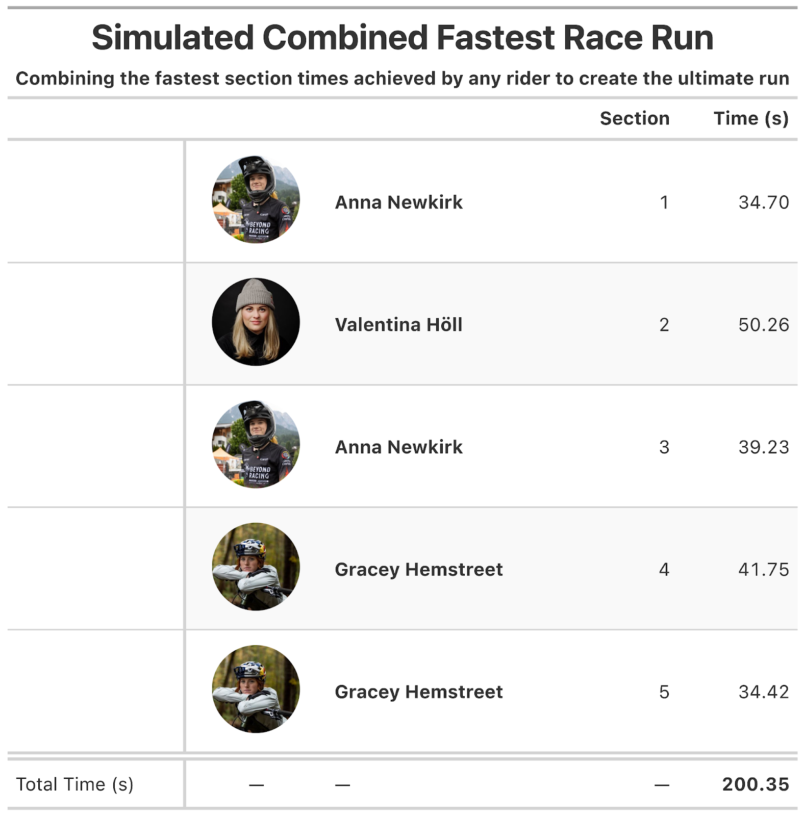 Just like before, weâre simulating each riderâs "perfect run" by cherry-picking their fastest split times from any run across the entire Leogang race weekend. The track was broken into five timed sections, and with up to eight recorded runs per rider (from timed training to qualifying and finals), we've got a solid bank of data to pull from. This allows us to combine those fastest segments for a theoretical best-case scenario.