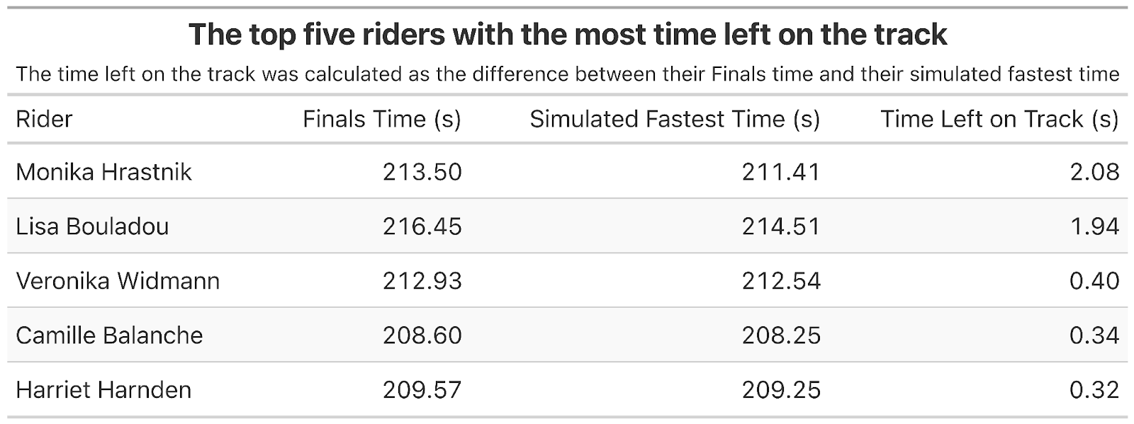 Diving deeper into the data we can also visualise which riders left the most time on the track. Interestingly, very few Elite Women were leaving much time out there, with only Monika Hrastnik and Lisa Bouladou leaving over a second on the hill.