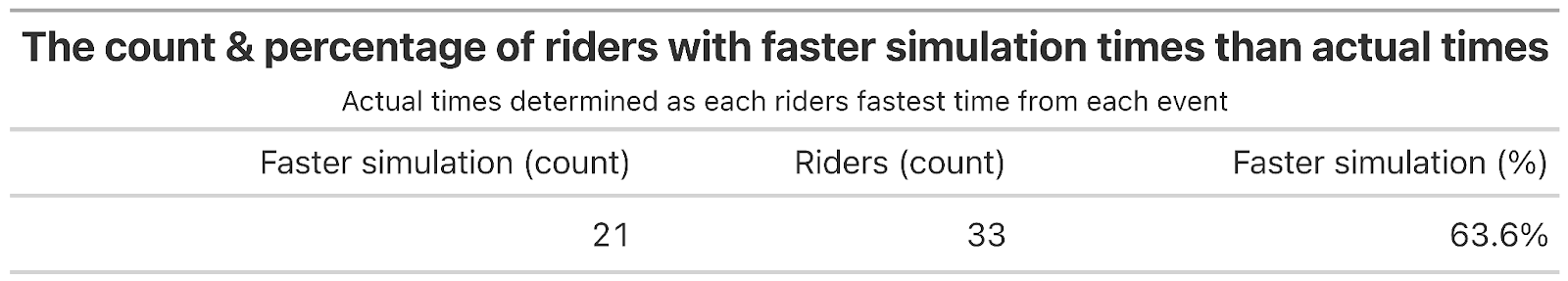 - Calculate the difference between each rider's fastest Qualifying run (1 or 2) and fastest Timed Training run.