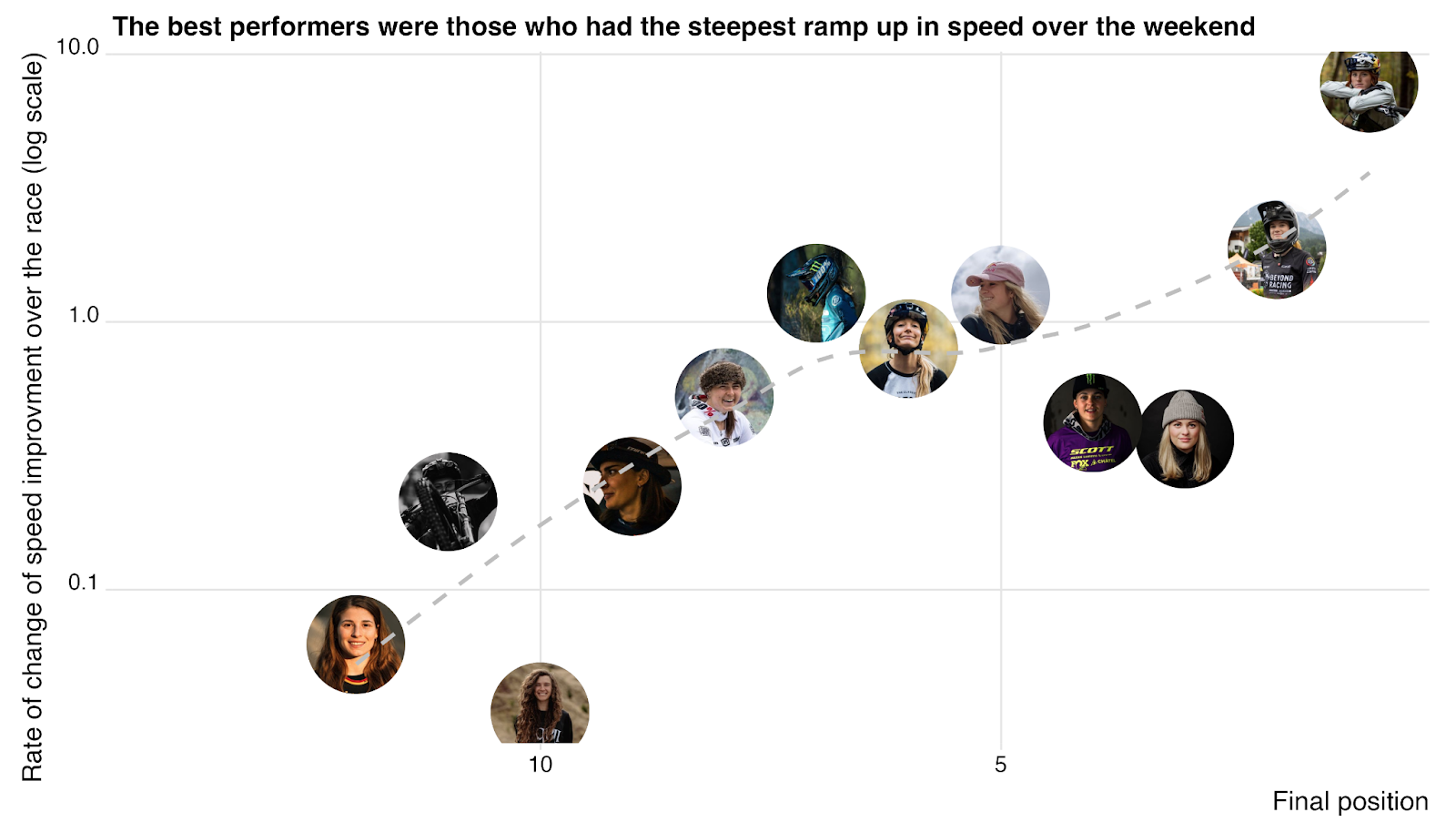 Calculating a Speed Improvement Index allows us to only compare relative performance between competitors, and not absolute performance. For instance, a rider could have a high index score (meaning the rate at which they built their speed over the weekend grew), but still have performed poorly as their overall Final time was still slow (even if it was much better than their initial Timed Training and Qualifying times).