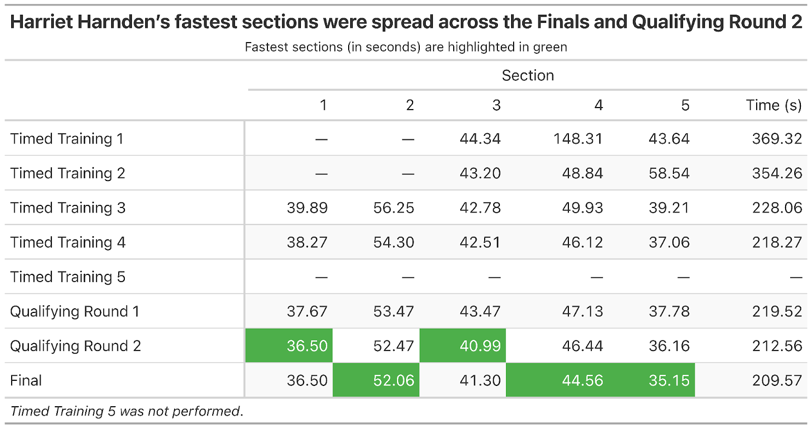 Take Harriet Harnden, for example. Her fastest actual run in the finals was 209.57s (3:29.57). But by piecing together her fastest segments from various runs throughout the weekend, split between Finals and Qualifying Round 2, her simulated "perfect run" clocks in at 209.26s (3:29.26) â a 0.3 second improvement. In a sport often decided by milliseconds, where would that have placed her? How would it have shuffled the overall standings?